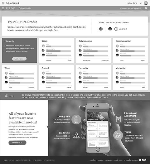 Other pages that were important to drill down on in the wireframe stage were the individual country profiles, course landing pages, and culture calculator (a self assessment test for determining your cultural characteristics and traits so that you can compare yourself to the cultures of other countries).